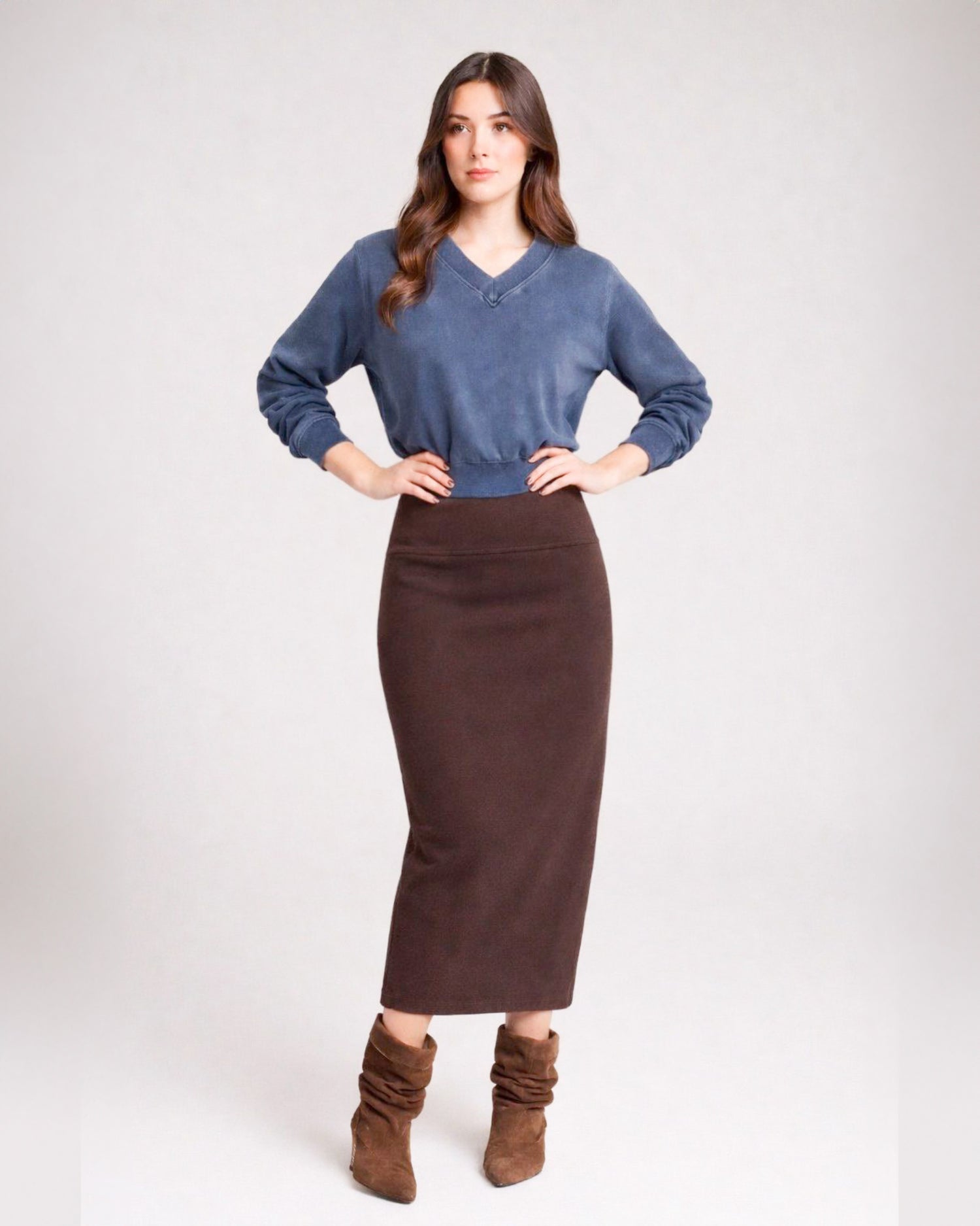 Falda tubo de tiro alto con cintura elástica. Tela stretch.