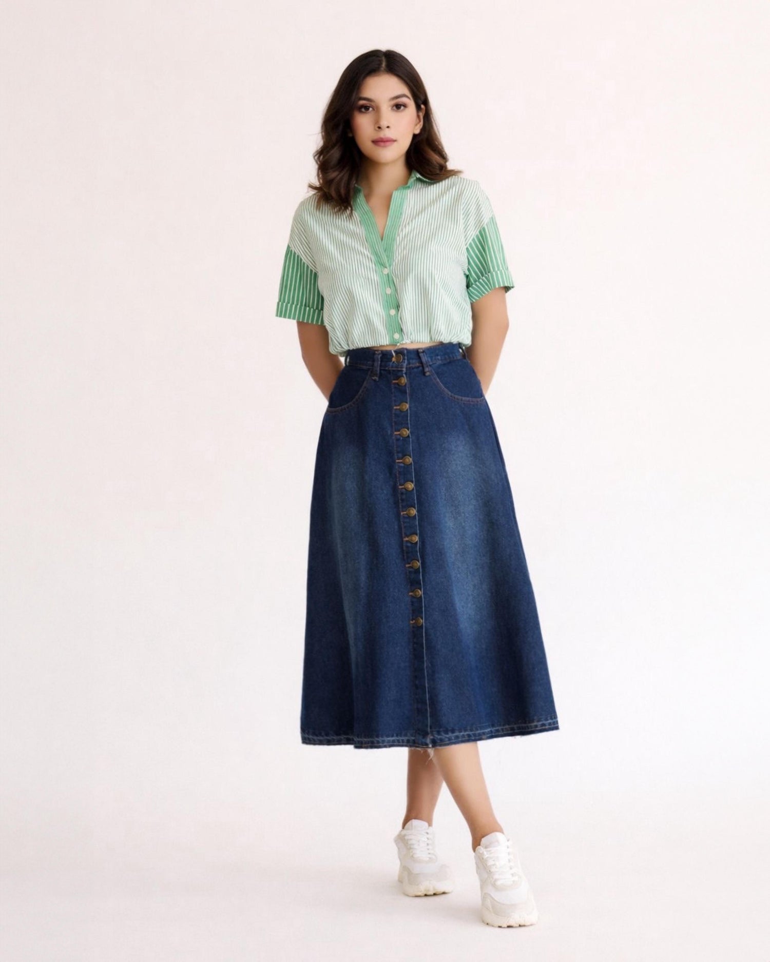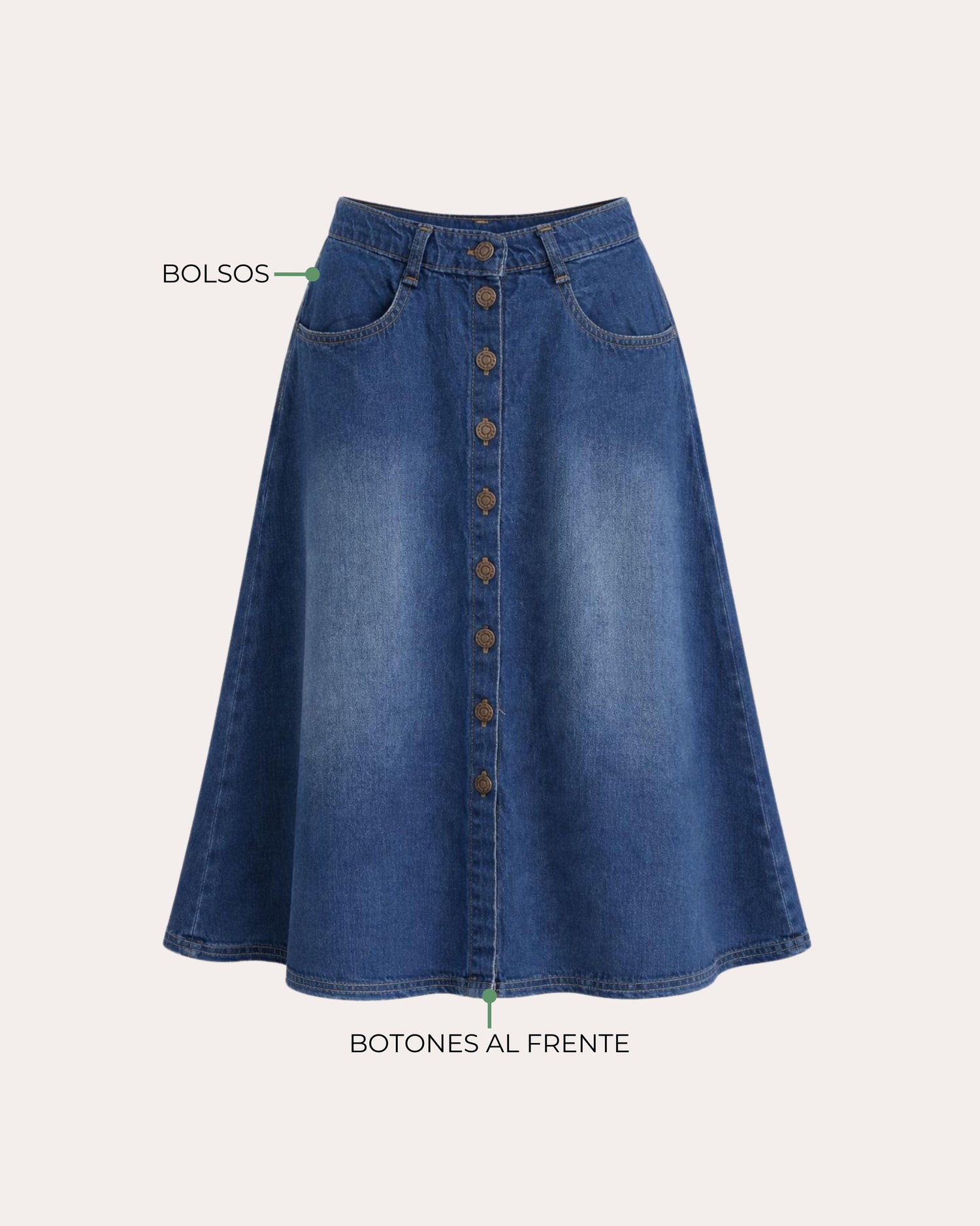 Flowy denim skirt with waistband. Front opening with metal buttons . Detail of chipped finish.